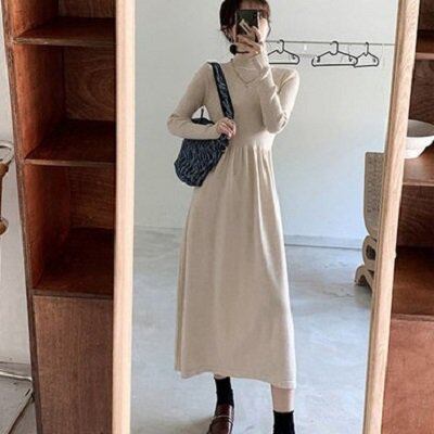 ワンピース ニットドレス レディース ガールズ カジュアル 長袖 千鳥格子 ミディ丈 ミリタリー ハイウエスト 秋冬 あたたか レトロ 襟 セーター