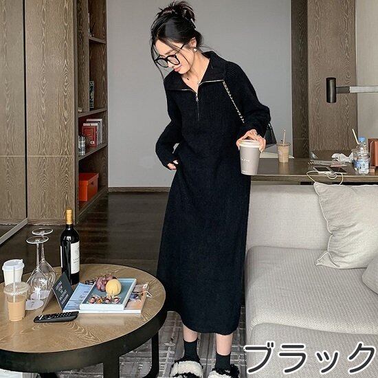ワンピース ニットドレス レディース ガールズ エレガント 長袖 フリース あったか ミディ丈 秋冬 新作 通勤 キレイ レース ラウンドネック