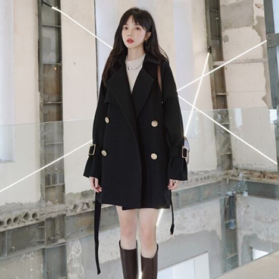 ショートコート レディース コート ショート丈 羽織 アウター ウエストベルト 黒 ブラック ゴールドボタン 金ボタン ダブルブレスト シンプル 無地 袖口ベルト カジュアル きれいめ お出かけ