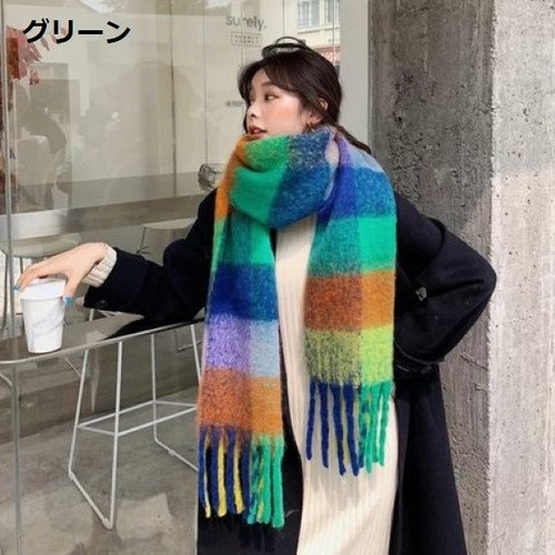 チェック柄マフラー レディース フリンジマフラー チェック柄 配色 カラフル ボリューム 冬 暖かいファッション小物 ショール 防寒 厚手 チェック柄マフラー 通勤通学 おしゃれ カジュアル