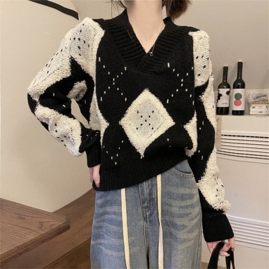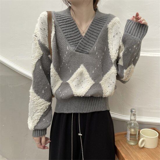ニットトップス Vネックセーター アーガイル柄 Vネックニット ニットプルオーバー 長袖 レディース 黒 ブラック グレー ショート丈 ゆったり レトロ かわいい カジュアル おしゃれ 秋 冬