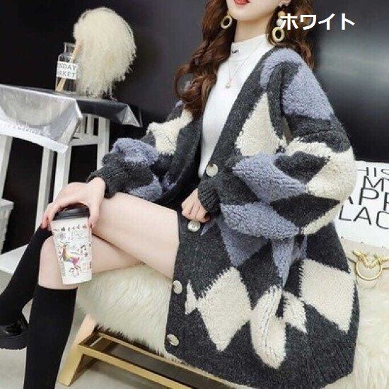 ニットカーディガン レディース ニット カーディガン 羽織 Vネック アーガイル模様 長袖 フロントボタン ゆったり ルーズ チェック柄 格子柄 配色 厚手 ライトアウター セーター カーディガン
