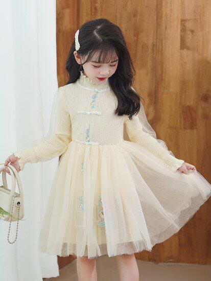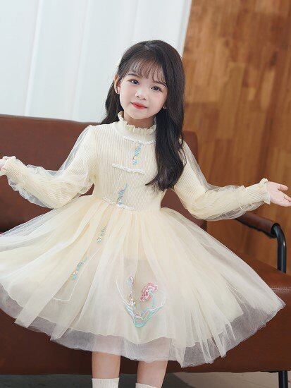卒園式 子供服 長袖ワンピース 女の子 キッズ ガールズ ワンピース スタンドカラー フリルカラー 可愛い プリンセス 入園式 入学式 フォーマル 発表会 刺繍 フレアワンピース 膝丈ワンピース
