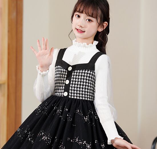 卒園式 子供服 ワンピース インナー 長袖 2点セット ツーピース 女の子 キッズ ガールズ ノースリーブワンピース チェック柄 スパンコール 可愛い リブニット カットソー フリルカラー 入園式