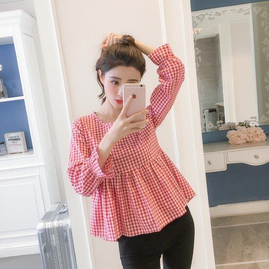 長袖ブラウス レディース トップス シャツ チェック柄 格子柄 カジュアル お出かけ おしゃれ コットン 綿 プルオーバー ラウンドネック 長袖 カットソー ペプラム 春夏 切り替え 長袖ブラウス
