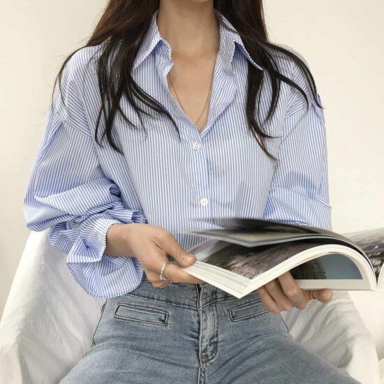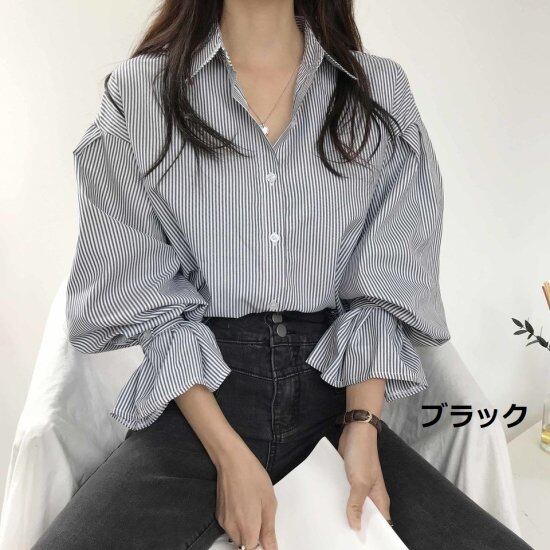 ブラウス ストライプシャツ キャンディスリーブ ボリューム袖 長袖 シャツ Vネック ランタンスリーブ ストライプ レディース トップス 黒 ブラック ブルー かわいい きれいめ オフィス おしゃれ