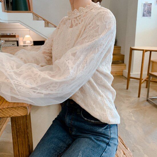 ブラウス レースブラウス レースプルオーバー 長袖 ハイネック ハーフカラー 総レース ランタンスリーブ ボリューム袖 レディース シャツ かわいい きれいめ 上品 おしゃれ セレモニー フォーマル
