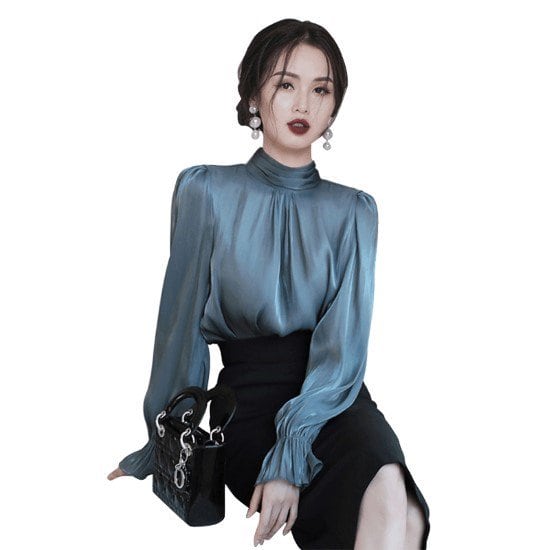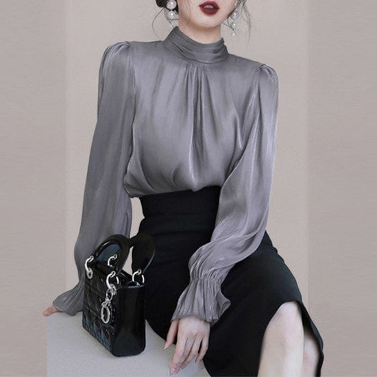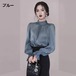 長袖ブラウス レディース トップス スタンドカラー プルオーバー 無地 きれいめ エレガント ラグジュアリー フォーマル パーティー お呼ばれ おしゃれ お出かけ グレー ブルー 長袖トップス 女性