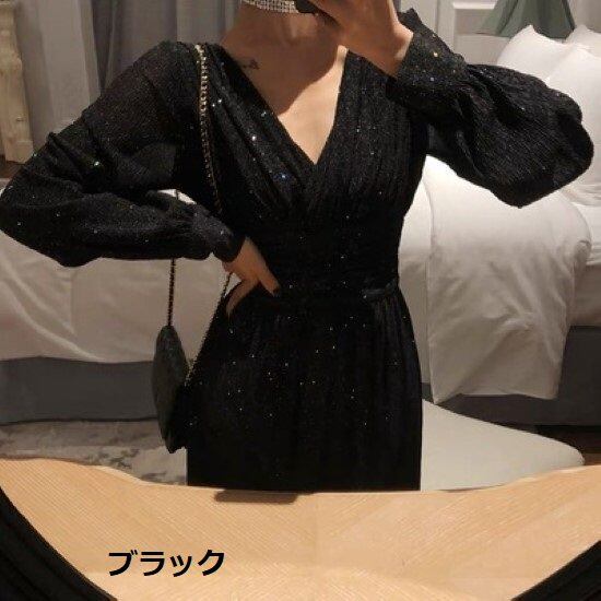 演奏会ドレス レディース パーティードレス 結婚式ドレス ワンピース ロングワンピース Vネック カシュクール 長袖 ラメ きらきら きれいめ エレガント お呼ばれ フォーマル ハイウエスト 女性