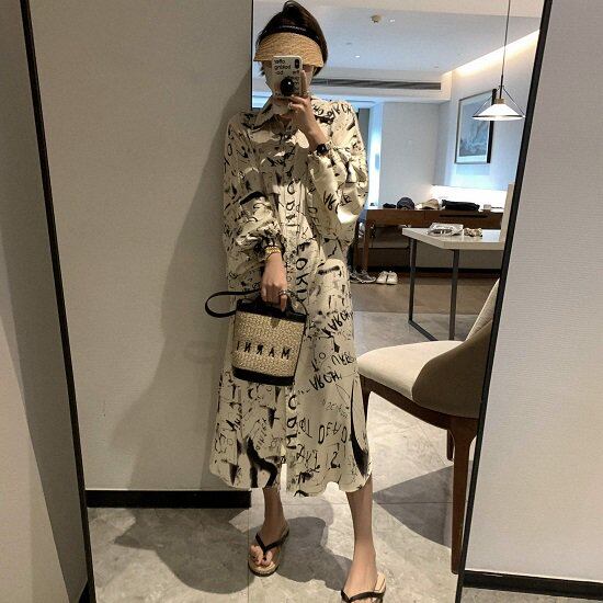 柄ワンピース シャツワンピース 英字ロゴ ロングワンピ シャツワンピ ゆったり 大人カジュアル 大きめサイズ 春ワンピ レディース 長袖 英字柄 おしゃれ 柄ワンピース シャツワンピース 英字ロゴ