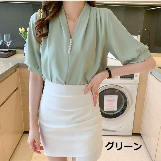 ブラウス Vネック パール付き 半袖ブラウス レディース シャツ シフォンブラウス パフスリーブ ドレープ 白 ホワイト グリーン きれいめ 上品 エレガント セレモニー オフィス おしゃれ 春夏