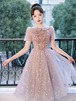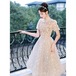 ワンピース ドレス ミドル丈 バイカラー 半袖 袖あり フレンチスリーブ ビーズ刺しゅう モノトーン 星柄 シフォン オーガンジー フレアスカート Aライン フェミニン 発表会 演奏会 大きいサイズ