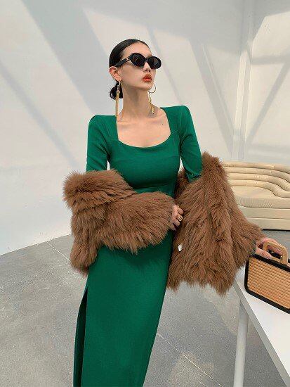 パーティードレス レディース 演奏会ドレス 結婚式ドレス ワンピース ロングワンピース 長袖 スクエアネック シンプル 無地 スリムフィット スリット フォーマル エレガント きれいめ お呼ばれ 女性