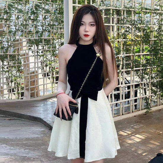 パーティードレス レディース ワンピースドレス 結婚式ドレス 演奏会ドレス コントラストカラー ミニワンピース ショート丈 ホルターネック リボン ノースリーブ きれいめ おしゃれ お呼ばれ
