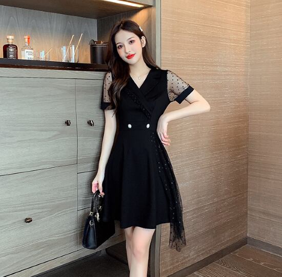 パーティードレス レディース ワンピースドレス 結婚式ドレス 演奏会ドレス シースルー きれいめ エレガント お呼ばれ フォーマル ブラック 黒 Vネック 水玉 ドット柄 ハイウエスト アシンメトリー