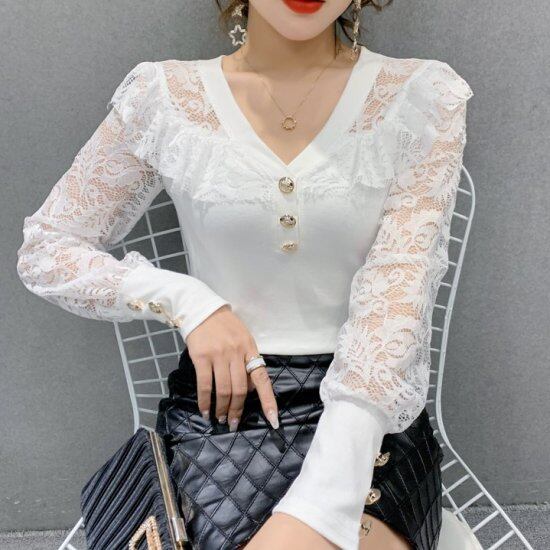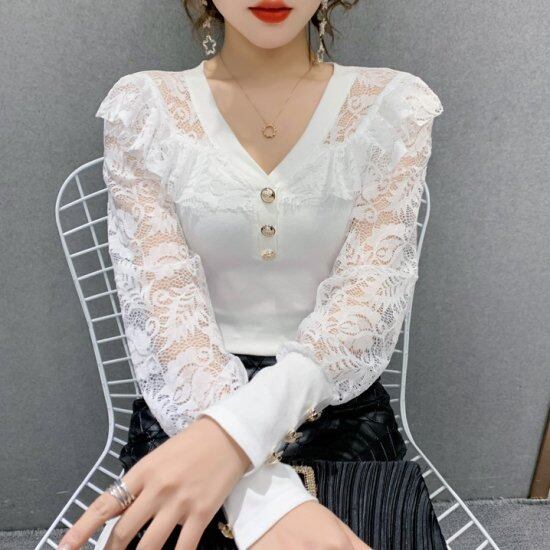 ブラウス レースブラウス Vネック レディース シャツ レースシャツ レーススリーブ 長袖 フリルブラウス 黒 ブラック 白 ホワイト かわいい きれいめ ガーリー セクシー おしゃれ お呼ばれ