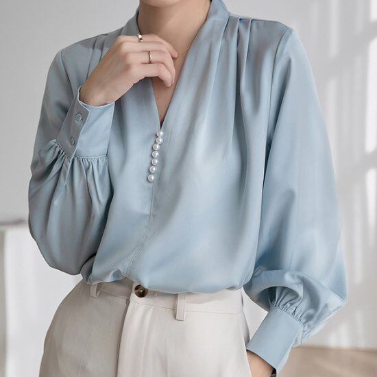 ブラウス Vネックブラウス パール付き レディース シャツ ノーカラーブラウス ボリューム袖 ランタンスリーブ 白 ホワイト ブルー きれいめ 上品 おしゃれ オフィス 卒入園 卒入学 セレモニー