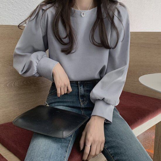 ブラウス パフスリーブブラウス 長袖ブラウス レディース シャツ ラウンドネック プルオーバー 襟なし 無地 シンプル ブルー レトロ クラシカル かわいい きれいめ カジュアル おしゃれ オフィス