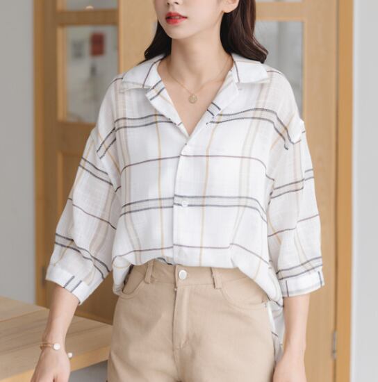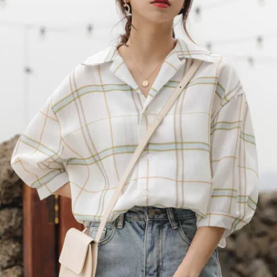 七分袖シャツ レディース ブラウス チェック柄 襟あり スーツ襟 フロントボタン ゆったり ルーズシルエット 薄手 春夏 カジュアル お出かけ おしゃれ シフォンブラウス シャツ フリーサイズ 女性