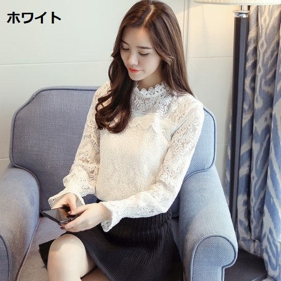 レースブラウス レディース トップス カットソー レース 長袖 シースルー フリル袖 スタンドカラー 黒 白 ブラック ホワイト プルオーバー カジュアル お出かけ おしゃれ きれいめ セクシー