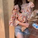 プリントブラウス レディース ブラウス トップス シャツ 肩見せ ストラップ 総柄 フリル袖 カジュアル お出かけ おしゃれ 可愛い 春夏 ゆったり ルーズ オレンジ 半袖 デコルテ ファッション