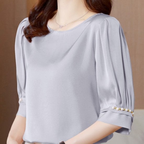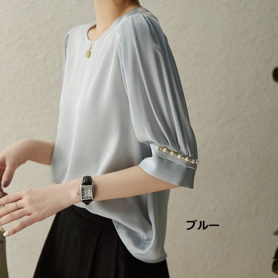 ブラウス 半袖ブラウス パール付きブラウス レディース シャツ プルオーバー ラウンドネック クルーネック 五分袖 七分袖 シルクタッチ レトロ クラシカル きれいめ 上品 おしゃれ 春 夏
