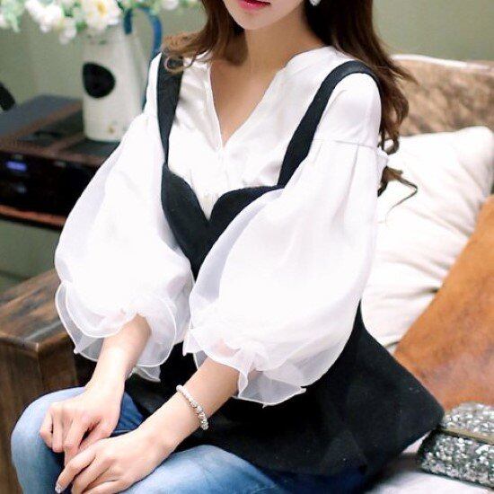 シフォンシャツ レディース トップス 長袖 キーネック Vネック 白シャツ ホワイト ボリューム袖 フロントボタン シンプル 無地 カジュアル お出かけ おしゃれ フリル 薄手 パフスリーブ 女性