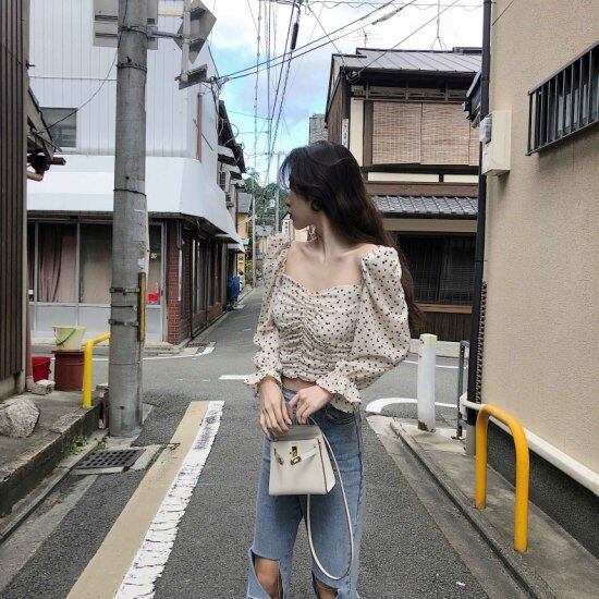 ブラウス 小花柄ブラウス スクエアネック レディース シャツ ショート丈 クロップド丈 シャーリング パフスリーブ プルオーバー 花柄 フラワープリント ハートネック ガーリー セクシー おしゃれ