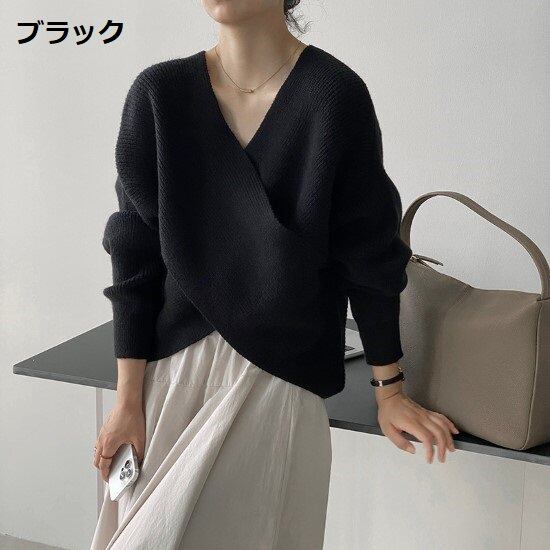 ニットセーター レディース トップス ニット セーター 長袖 Vネック クロスデザイン シンプル 無地 カジュアル お出かけ おしゃれ きれいめ ゆったり ルーズ フリーサイズ シック ファッション