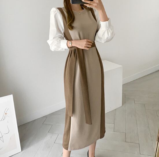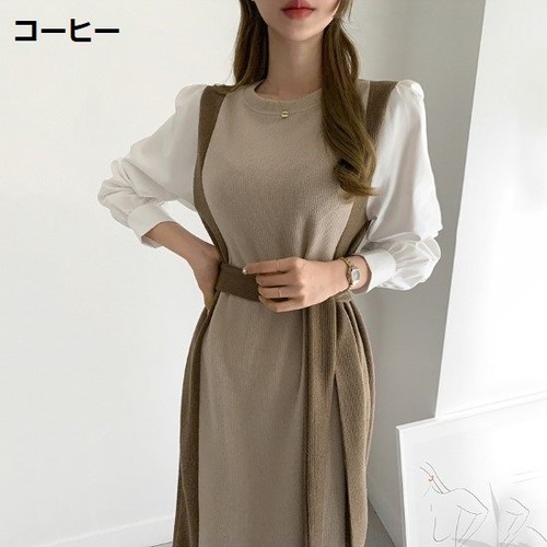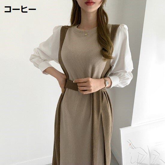 ニットワンピース レディース 膝下ワンピース フェイクツーピース 重ね着風 ラウンドネック 長袖 ウエストベルト パフスリーブ ボリューム袖 カジュアル お出かけ おしゃれ きれいめ オフィス 女性