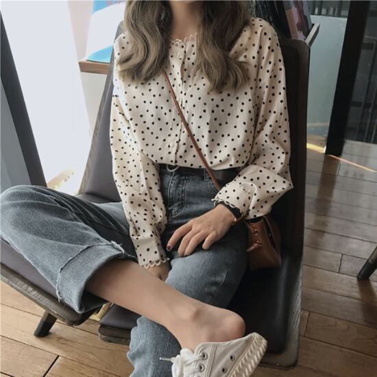 ドット柄シャツ レディース ブラウス 長袖 トップス 水玉 ドット ラウンドネック フロントボタン カジュアル お出かけ おしゃれ 春夏 レトロ ゆったり ルーズ ファッション 女性 アプリコット