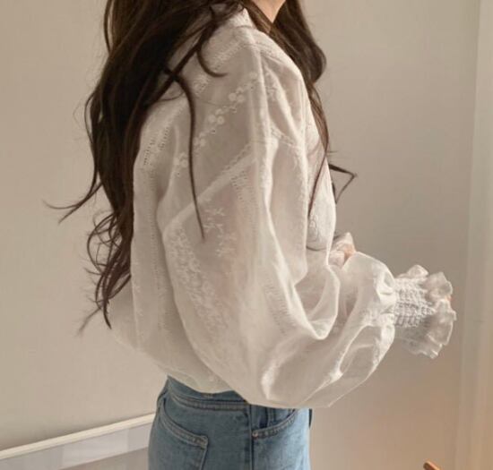 レースブラウス レディース トップス 長袖シャツ 総レース ボリューム袖 綿 コットン フリル袖 白ブラウス ホワイト カジュアル お出かけ おしゃれ 可愛い レース ラウンドネック ファッション