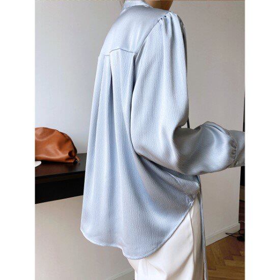 長袖シャツ レディース ブラウス ボウタイ リボン Vネック トップス フロントボタン ドレープ 光沢 シンプル 無地 きれいめ カジュアル お出かけ おしゃれ エレガント OL オフィス フォーマル