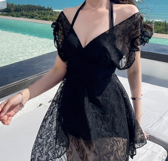 ワンピース水着 レディース 水着 スイムウェア ビーチウェア Vネック ホルターネック レース シースルー ハイウエスト バックオープン ブラック ホワイト 海 ビーチ プール 海水浴 リゾート 夏
