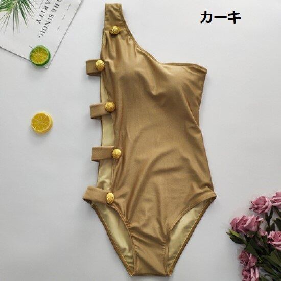 ワンピース水着 レディース 水着 スイムウェア ビーチウェア ワンショルダー サイドオープン ゴールドボタン カジュアル セクシー 個性的 無地 おしゃれ 海 夏 ビーチ プール 海水浴 リゾート