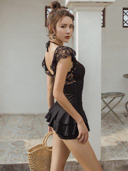 ワンピース水着 レディース 水着 レース シースルー Vネック フリル 体型カバー 黒 ブラック バックオープン カジュアル セクシー 可愛い おしゃれ 海 プール ビーチ 海水浴 スイムウェア 女性