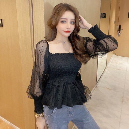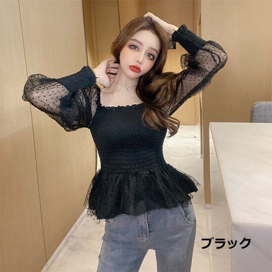 ブラウス シャツ レースブラウス レディース スクエアネック オフショルダー シャーリングブラウス ペプラム 透け感 シアー フリル ドット柄 水玉 パフスリーブ かわいい ガーリー おしゃれ 春夏