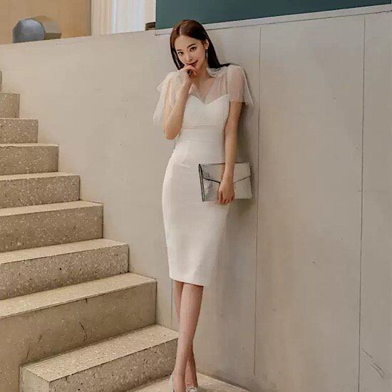 結婚式ドレス 無地 レース タイト スリムフィット 肩リボン 膝丈 発表会 演奏会 レディース フレアドレス 結婚式 ステージ衣装 エレガント ウエディングドレス カラードレス シンプル