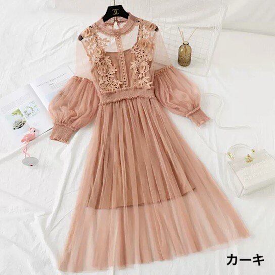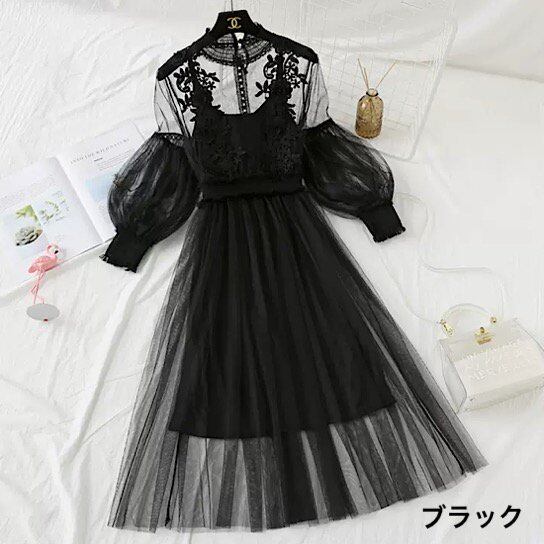 結婚式ドレス レース 長袖 ラウンドネック シースルー レトロ 透け感 発表会 演奏会 レディース フレアドレス 結婚式 ステージ衣装ミモレ丈 エレガント ウエディングドレス カラードレス