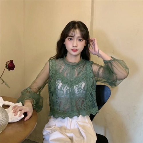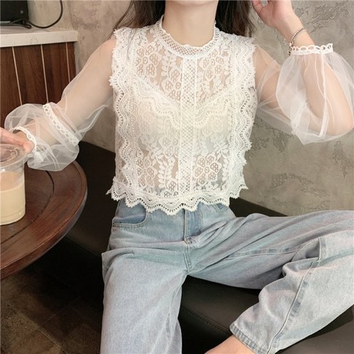 ブラウス レースプルオーバー 透け感 レディース シャツ シースルー スタンドカラー ハイネック ボリューム袖 ランタンスリーブ 総レース かわいい きれいめ ガーリー セクシー おしゃれ 春夏