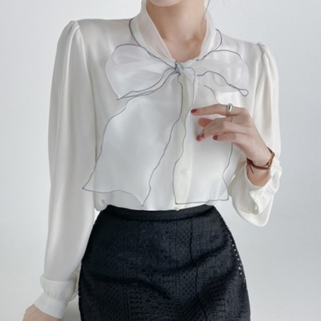 ブラウス シャツ リボンブラウス レディース ボウタイブラウス リボンタイ オーガンジー 長袖ブラウス 透け感 ブラック ホワイト かわいい きれいめ 上品 オフィス パーティー 卒入園 卒入学