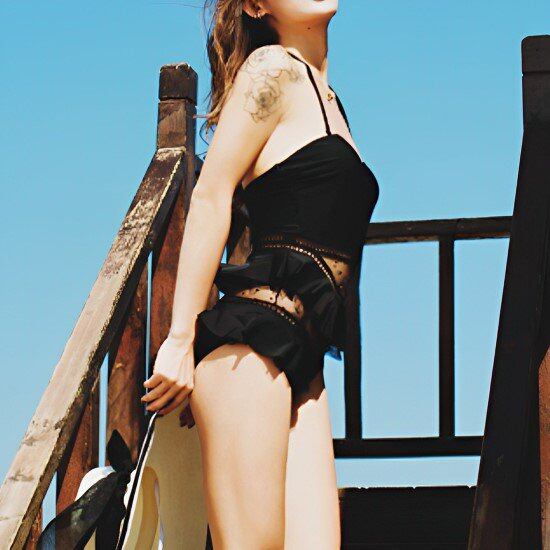 ワンピース水着 レディース 水着 ホルターネック シースルー フリル レース ドット柄 水玉 可愛い おしゃれ カジュアル 海 プール 夏 海水浴 ビーチ リゾート スイムウェア ブラック セクシー