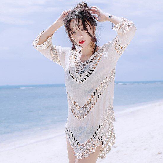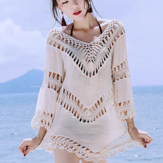 ビーチウェア レディース カバーアップ プルオーバー レース Vネック ゆったり ルーズ ボヘミアン 夏 海 プール 海水浴 UV対策 日焼け防止 リゾート トップス 七分袖 クロシェ編み レース