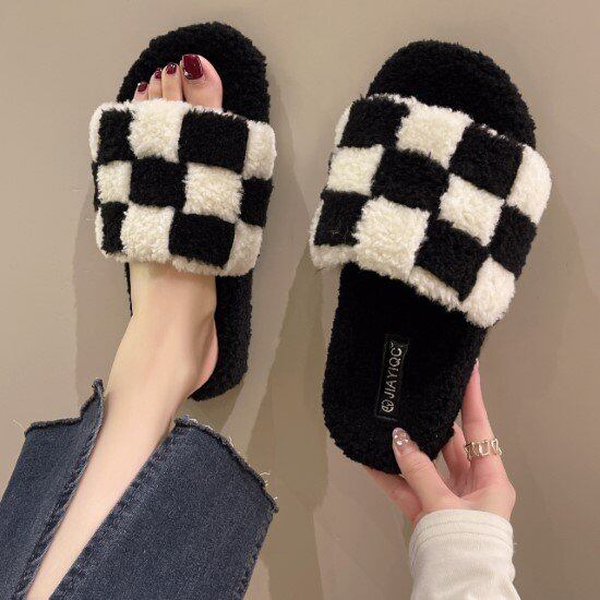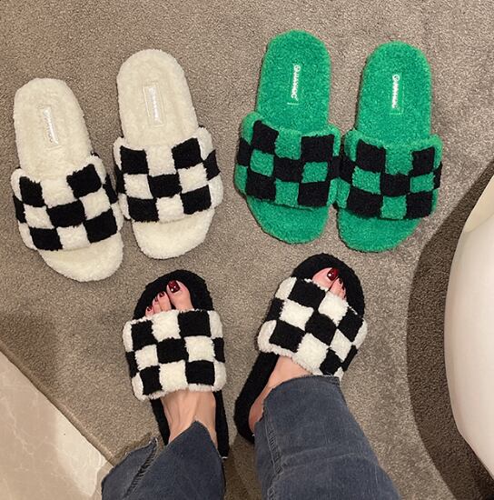 サンダル レディース 靴 シューズ ルームシューズ ルームサンダル チェック柄 ふわふわ フラットサンダル カジュアル おしゃれ 歩きやすい 疲れにくい 履きやすい バイカラー ウール サンダル 女性