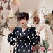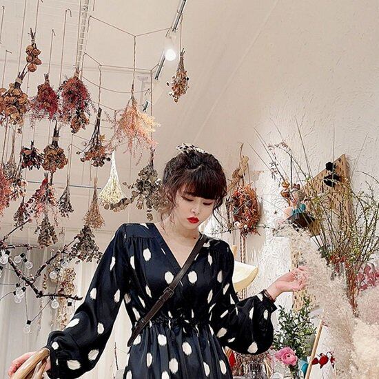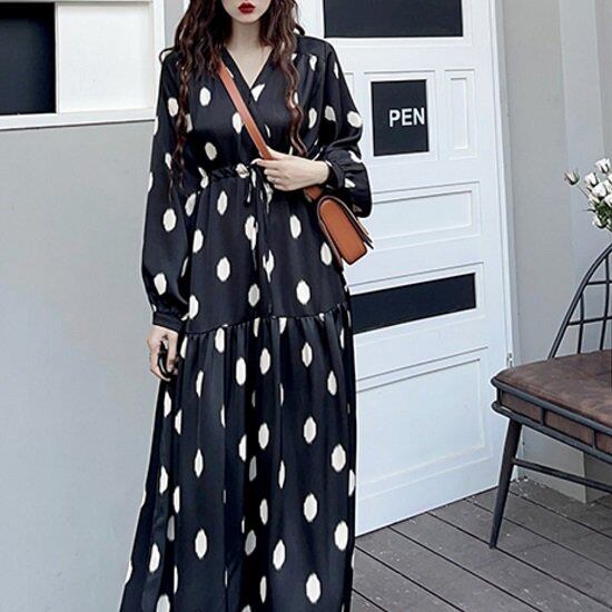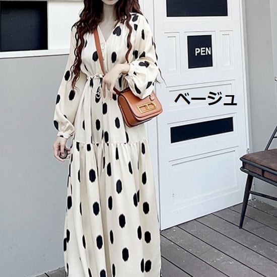 ドットワンピース ロングワンピース 水玉 ドット柄 大きいサイズ ゆったり ロング丈 長袖 切り替えワンピ ウエストマーク Vネック フレアワンピ ドットワンピース ロングワンピース 水玉