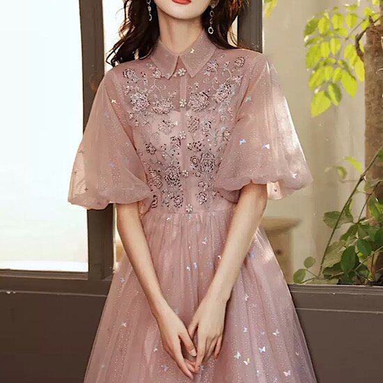 結婚式ドレス パフスリーブ ハイウエスト 襟付き ロング丈 発表会 演奏会 レディース 結婚式 ステージ衣装 エレガント ウエディングドレス カラードレス イブニングドレス 五部袖