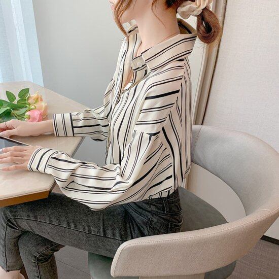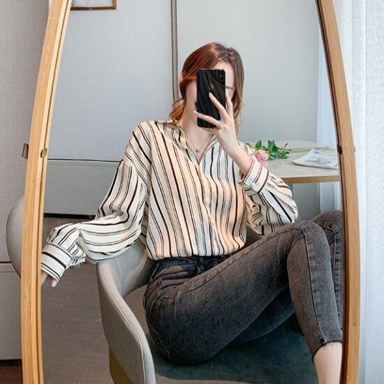 シャツ レディース ブラウス ストライプ 長袖 Vネック シャツカラー ストライプシャツ ゆったり ルーズ プリントシャツ シャープ きれいめ カジュアル おしゃれ オフィスコーデ 長袖ブラウス