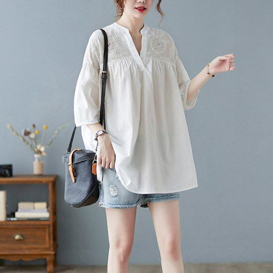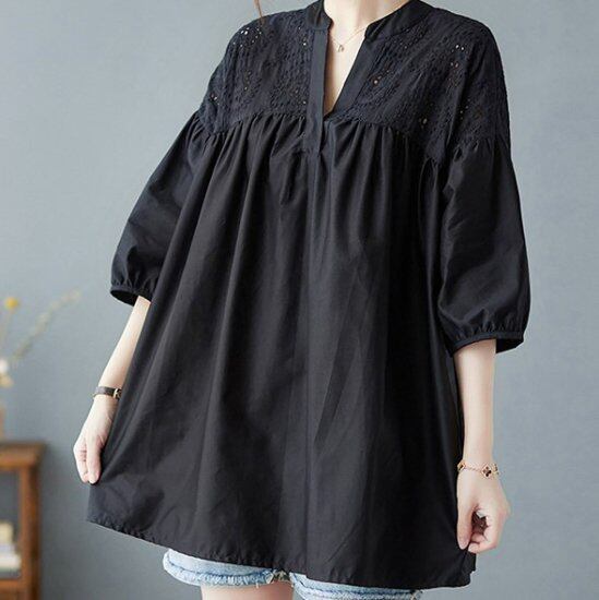 ブラウス レディース 七分袖 大きいサイズ チュニック Vネック レース ゆったり 白ブラウス 黒ブラウス チュニックブラウス 春夏 春 夏 ドロップショルダー 刺繍 シャツブラウス 刺