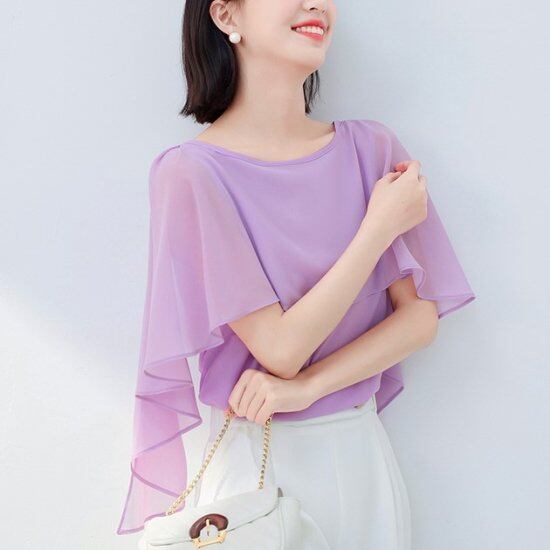 ブラウス レディース シャツ プルオーバー シフォンブラウス ケープ ショール レイヤード マント フリルスリーブ 緑 グリーン パープル ラウンドネック 無地 きれいめ エレガント おしゃれ 春夏