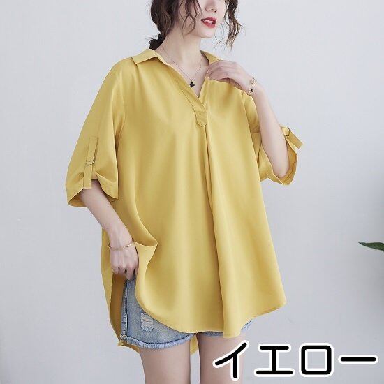 ブラウス レディース 大きいサイズ 五分袖 七分袖 チュニックブラウス チュニック丈 オフィス ゆったり オーバーサイズ 薄手 襟付 ロング丈 体型カバー シャツブラウス 春夏 春 夏 ロングブラウス